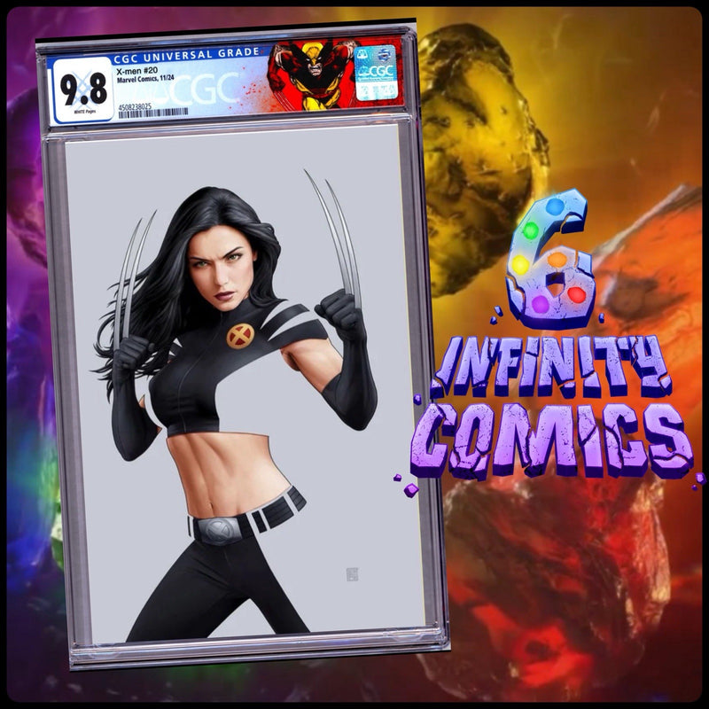 The product is a graded CGC 9.8 comic book titled X-MEN #20 JTC Tyler Christopher Canada Expo Negative X-23 Virgin Variant. This modern age comic book published by Marvel Comics is intended for a general audience and is a key issue in the series Uncanny X-Men.